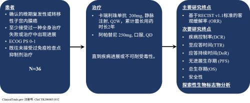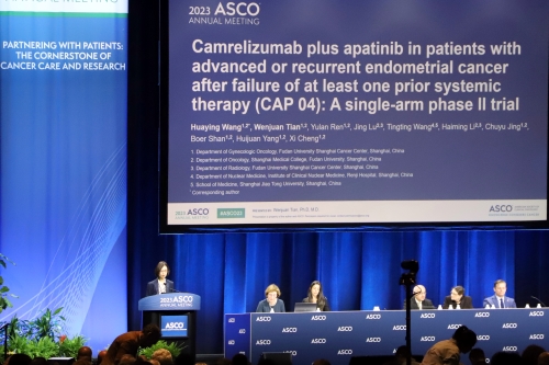 正在進行的2023年美國臨床腫瘤學會(ASCO)年會上,復旦大學附屬腫瘤醫院田文娟教授以口頭報告的形式公布了卡瑞利珠單抗(艾瑞卡?)聯合阿帕替尼(艾坦?)(“雙艾”組合)治療既往至少接受過一種全身治療失敗的晚期或復發性子宮內膜癌患者臨床研究(CAP 04研究)Ⅱ期研究的最新結果:“雙艾”組合在該人群中確認的客觀緩解率(ORR)和疾病控制率(DCR)分別為44.4%、91.7%,中位無進展生存期(PFS)為6.4個月,中位總生存期(OS)達到21.0個月,表現出令人鼓舞的抗腫瘤活性,有望成為晚期或復發性子宮內膜癌患者新的治療選擇[1]。