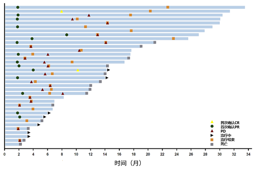36例患者中,有13例(36.1%)在第1次影像學評估時即發生應答。截至本次數據分析,7例患者仍在接受治療。