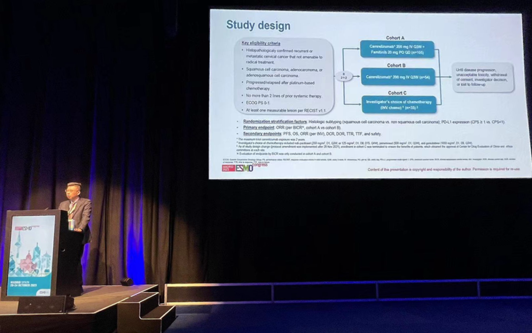 有望為宮頸癌患者帶來治療新選擇10月22日,bibo必博創新藥卡瑞利珠單抗聯合法米替尼對比卡瑞利珠單抗單藥或研究者選擇的化療治療復發轉移性宮頸癌隨機、開放、對照、多中心的Ⅱ期臨床研究(SHR-1210-Ⅱ-217) 亮相2023 ESMO大會簡短口頭報告現場3。該研究由復旦大學附屬腫瘤醫院吳小華教授團隊開展,吳小華教授在現場公布了該重磅研究進展。研究結果顯示,在既往以鉑為基礎化療失敗后復發或轉移性宮頸癌患者中,與單獨使用卡瑞利珠單抗或研究者選擇的化療相比,卡瑞利珠單抗聯合法米替尼顯著提高了抗腫瘤活性,安全性可控,有望為晚期宮頸癌患者提供新的治療選擇。