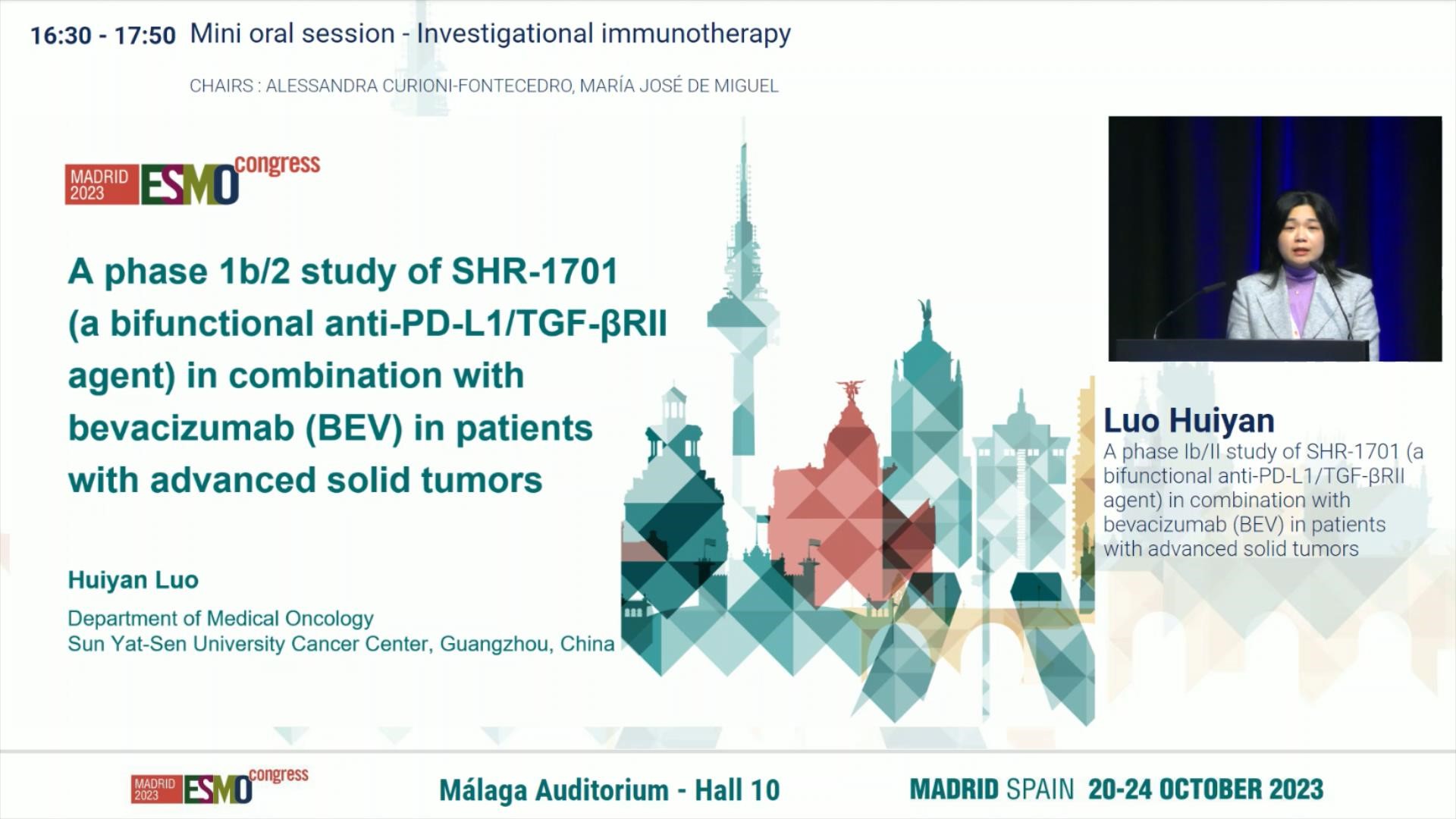 10月21日,bibo必博創新藥SHR-1701聯合貝伐珠單抗(BEV)治療晚期實體瘤患者的1b/2期研究亮相2023 ESMO大會簡短口頭報告現場6。該研究由中山大學腫瘤防治中心徐瑞華教授擔任主要研究者,中山大學腫瘤防治中心的駱卉妍教授在現場公布該研究的重要進展。研究結果表明,SHR-1701聯合貝伐珠單抗在晚期胃或胃食管連接部癌(GC/GEJC)和非鱗狀非小細胞肺癌(nsqNSCLC)患者中顯示出令人鼓舞的抗腫瘤活性和良好的安全性,為后續GC/GEJC和nsqNSCLC的相關研究開辟了一條嶄新道路。