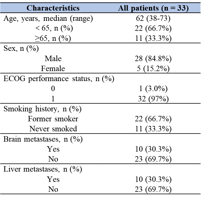 將2020年10月至2023年1月接受阿得貝利單抗聯合放化療治療的33例ES-SCLC患者納入研究分析,中位年齡為62歲(38-73歲),其中,28例患者為男性(84.8%),22例患者具有吸煙史(66.7%),32例患者ECOG PS評分為1(97%)。基線時,10例患者存在腦轉移(30.3%),10例患者存在肝轉移(30.3%)。