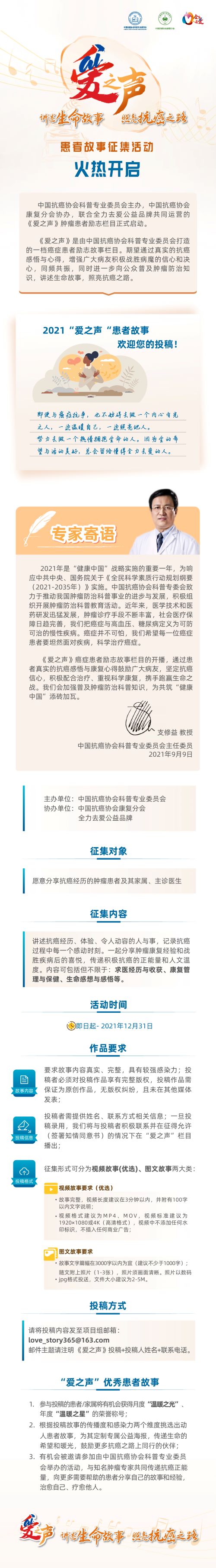 中國抗癌協會科普專業委員會主任委員支修益教授指出:“2021年是‘健康中國’戰略實施的重要一年。為積極響應并貫徹實施中共中央、國務院關于《全民科學素質行動規劃綱要(2021-2035年)》,中國抗癌協會科普專委會始終致力于推動我國腫瘤防治科普事業的進步與發展,積極組織開展腫瘤防治科普教育活動。期望通過《愛之聲》腫瘤患者勵志故事欄目,以真實的抗癌感悟與康復心得鼓勵廣大病友,堅定抗癌信心,積極配合治療、重視科學康復,攜手打贏生命之戰,為共筑‘健康中國’添磚加瓦。”