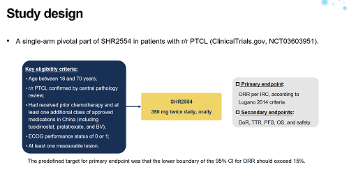SHR2554是一種口服、選擇性小分子EZH2抑制劑,對野生型和突變型EZH2均表現出強抑制性。為評估 SHR2554 在復發/難治性成熟淋巴腫瘤(包括B細胞淋巴瘤、T細胞淋巴瘤和經典型霍奇金淋巴瘤)患者中的安全性、藥代動力學、藥效學和初步臨床活性,開展了一項SHR2554首次人體、劑量遞增、劑量擴展和臨床擴展的多中心、2-PART臨床研究(NCT03603951)。PART 1研究中,確定了 SHR2554的推薦劑量為 350 mg每日兩次口服,并且研究結果初步顯示出了 SHR2554對包括PTCL在內的多種淋巴瘤類型均表現出較強的抗腫瘤活性[8,9]。因此繼續開展PART 2作為SHR2554在R/R PTCL的單臂關鍵性研究,來進一步評估SHR2554在R/R PTCL患者中的療效和安全性,本次EHA口頭報告了此項研究的結果。