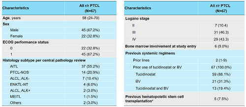 研究共納入67例患者接受SHR2554治療,包括37例(55.2%)血管免疫母細胞性T細胞淋巴瘤(AITL),14例(20.9%)PTCL-NOS,7例(10.4%)間變性淋巴瘤激酶陰性的間變性大細胞淋巴瘤(ALCL,ALK-),4例(6.0%)結外NK/T淋巴細胞淋巴瘤鼻型(ENKTL-NT),2例(3.0%)ALCL-ALK陽性(ALCL,ALK+),1例(1.5%)單形性嗜上皮性腸道T細胞淋巴瘤(MEITL),2例(3.0%)其他亞型。既往中位治療線數為2(范圍,1-9)。所有患者既往均接受過化療方案;此外,所有患者均接受過西達本胺或維布妥昔單抗治療(西達本胺,59[88.1%];維布妥昔單抗,21[31.3%];同時接受過兩種藥物治療,13[19.4%])。