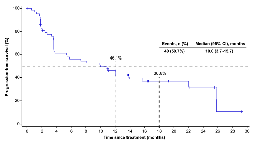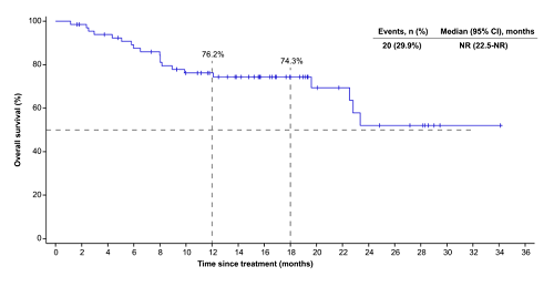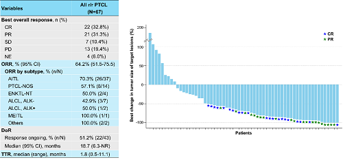 截至2024年12月20日,中位隨訪時間15.2個月,22例(32.8%)患者達到完全緩解,21例(31.3%)達到部分緩解,IRC評估的ORR為64.2%(95% CI,51.5-75.5)。在所有亞型中均觀察到獲益(ORR:AITL,70.3%[26/37];PTCL-NOS,57.1%[8/14];ENKTL-NT,50.0%[2/4];ALCL,ALK-,42.9%[3/7];ALCL,ALK+,50.0%[1/2];MEITL,100%[1/1];其他,100%[2/2])。在出現緩解的患者中,51.2%(22/43)的患者目前仍在緩解中,估計的中位DoR為18.7個月(95% CI,6.3-未達到[NR])。中位PFS為10.0個月(95% CI,3.7-15.7),中位OS尚未達到。安全性整體可控。
