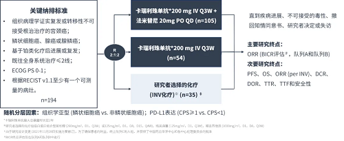 本研究是一項(xiàng)隨機(jī)、開放標(biāo)簽、對(duì)照、多中心的II期臨床研究,在全國(guó)33家中心納入總計(jì)194例18-75周歲、組織病理學(xué)確認(rèn)的復(fù)發(fā)或轉(zhuǎn)移性宮頸鱗癌、腺癌和腺鱗癌、含鉑化療失敗且既往經(jīng)過系統(tǒng)治療≤2線的患者,2:1:2隨機(jī)分配到卡瑞利珠單抗(200 mg IV Q3W)聯(lián)合法米替尼(20 mg PO QD)(A組)、卡瑞利珠單抗(200 mg IV Q3W)(B組)和研究者選擇的化療(C組)。研究設(shè)計(jì)如圖: