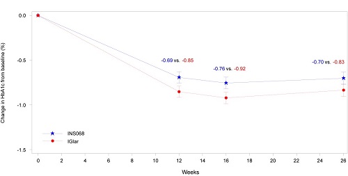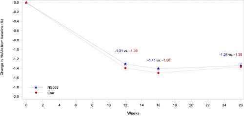本研究達到預設的主要終點,治療26周后,INS068組的HbA1c相對基線變化非劣于IGlar組。INS068 組與 IGlar組的HbA1c降幅分別為 1.34% 和 1.36%, 兩組差值為 0.02%(95% CI:-0.14%,0.18%)。