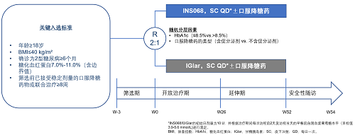 研究納入已接受基礎胰島素治療≥8周,糖化血紅蛋白(HbA1c)7.0%-10.0%的成年T2DM患者。符合納入標準的受試者按1:1比例隨機分組,接受INS068或甘精胰島素(IGlar)每日一次(QD)皮下注射治療。胰島素起始劑量根據患者此前使用的基礎胰島素劑量進行換算,治療期間進行劑量滴定(目標血糖:早餐前自我監測指尖血糖 3.9~5.6mmol/L)。