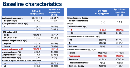 從2022年8月4日到2024年8月9日,共287例符合條件的患者入組。截至2025年6月30日,瑞康曲妥珠單抗組的中位隨訪時間為15.9個月(95%CI:14.6-17.1),吡咯替尼聯合卡培他濱組的中位隨訪時間為15.3個月(95%CI:14.3-16.6)。73.5%的患者存在內臟轉移,34.5%的患者存在肝轉移,44.3%的患者存在肺轉移。接近100%的患者既往接受過曲妥珠單抗治療,72.1%的患者既往接受過帕妥珠單抗治療。