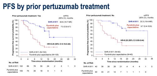 對于既往接受過帕妥珠單抗治療的患者,瑞康曲妥珠單抗組的中位PFS為30.6個月(95%CI:16.7-NR),吡咯替尼聯合卡培他濱組的中位PFS為7.0個月(95%CI:5.6-9.7),HR=0.25(95%CI:0.16-0.40)。對于既往未接受過帕妥珠單抗治療的患者,瑞康曲妥珠單抗組的中位PFS為33.3個月(95%CI:19.4-NR),吡咯替尼聯合卡培他濱組的中位PFS為9.7個月(95%CI:5.4-16.6),HR=0.20(95%CI:0.09-0.44)。