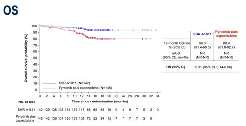 研究達到了主要終點。BICR評估的中位PFS方面,瑞康曲妥珠單抗組達到30.6個月(95%CI:16.8-NR),吡咯替尼聯合卡培他濱組為8.3個月(95%CI:6.9-11.0)。HR=0.22(95%CI:0.15-0.34,P<0.0001)。