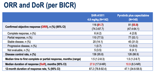 瑞康曲妥珠單抗組的客觀緩解率(ORR)為81.7%,吡咯替尼聯合卡培他濱組的ORR為55.9%。瑞康曲妥珠單抗組的中位緩解持續時間(DoR)為27.8個月(95%CI:17.8-NR),吡咯替尼聯合卡培他濱組的中位DoR為10.9個月(95%CI:8.3-NR)。